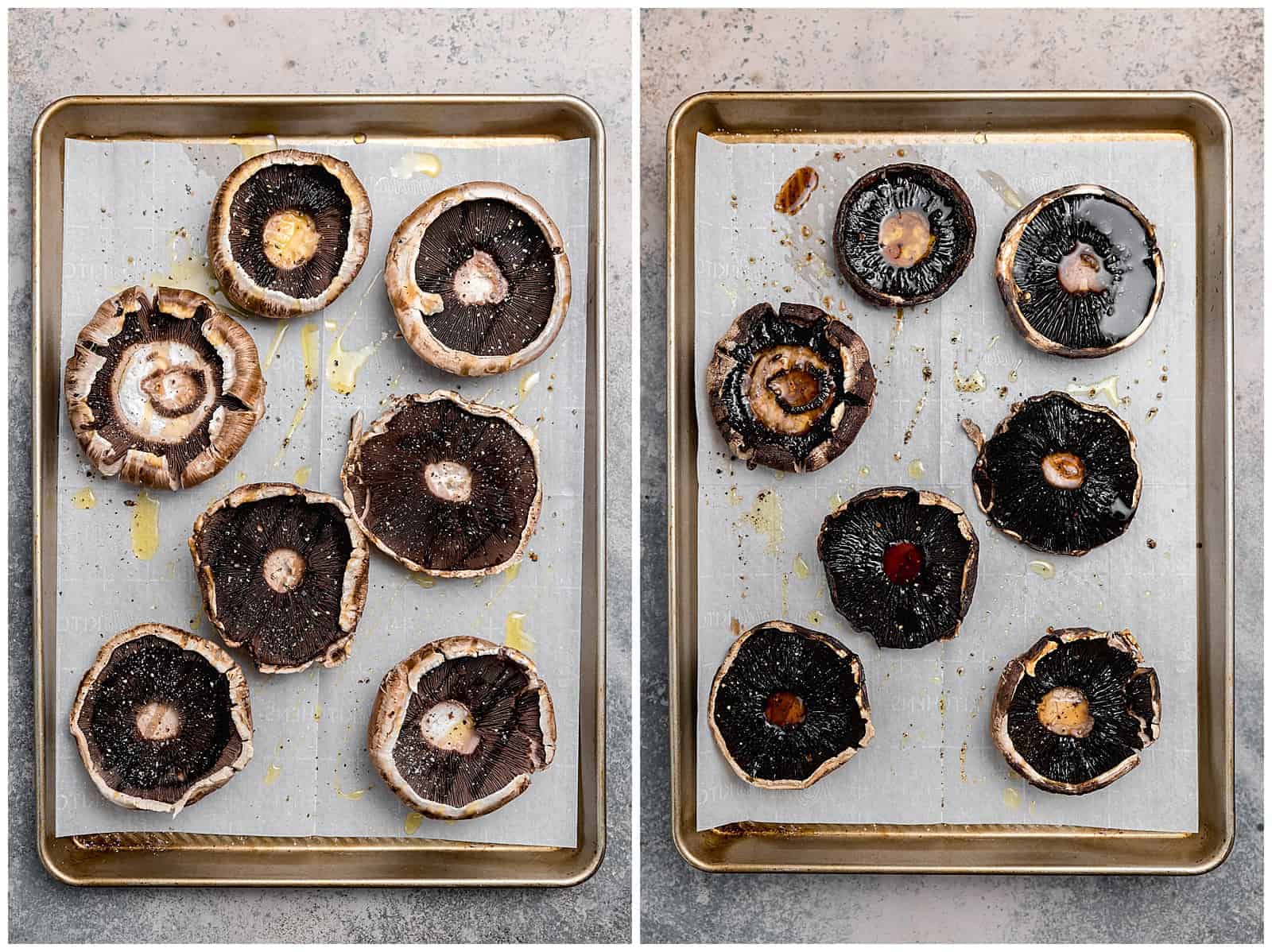 - Panggang tutup jamur.Mulailah dengan memanggang tutup jamur portobello di atas loyang besar berbingkai. Anda dapat melewati langkah ini, tetapi saya menyukai tekstur yang diberikan pada jamur.Untuk tip: pindahkan tutup jamur ke loyang bersih yang dilapisi perkamen karena akan mengeluarkan banyak air saat dimasak.
