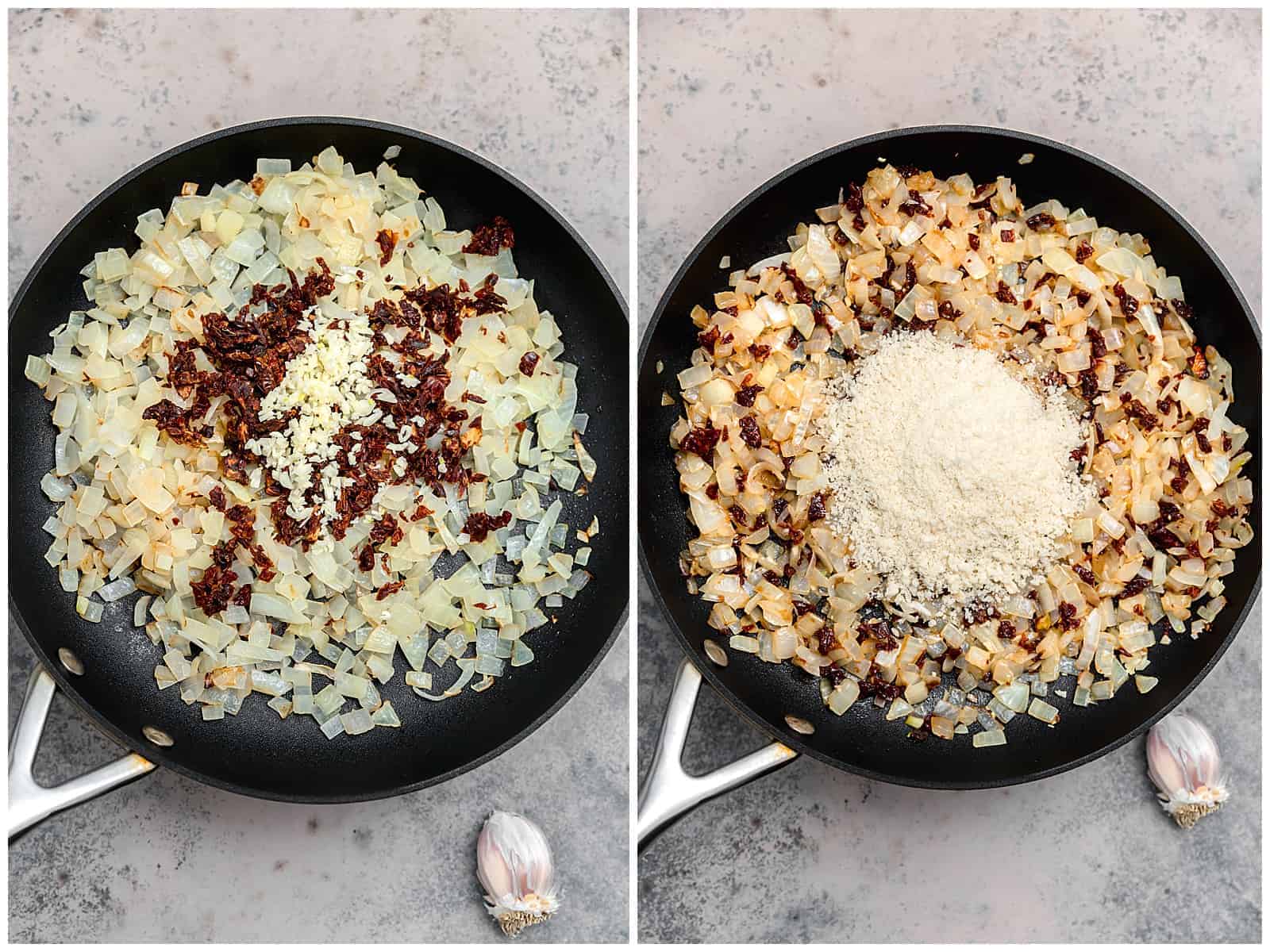 Tumis bawang bombay.Panaskan 2 sendok makan minyak zaitun dalam wajan dengan api sedang-besar. Tumis bawang bombay sekitar6-8 menit,atau sampai agak kecoklatan dan lembut sambil sesekali diaduk. Tambahkan ½ cangkir tomat kering cincang, bawang putih, dan ¼ sdt serpihan cabai merah yang dihancurkanmasak 1 menit lagi.